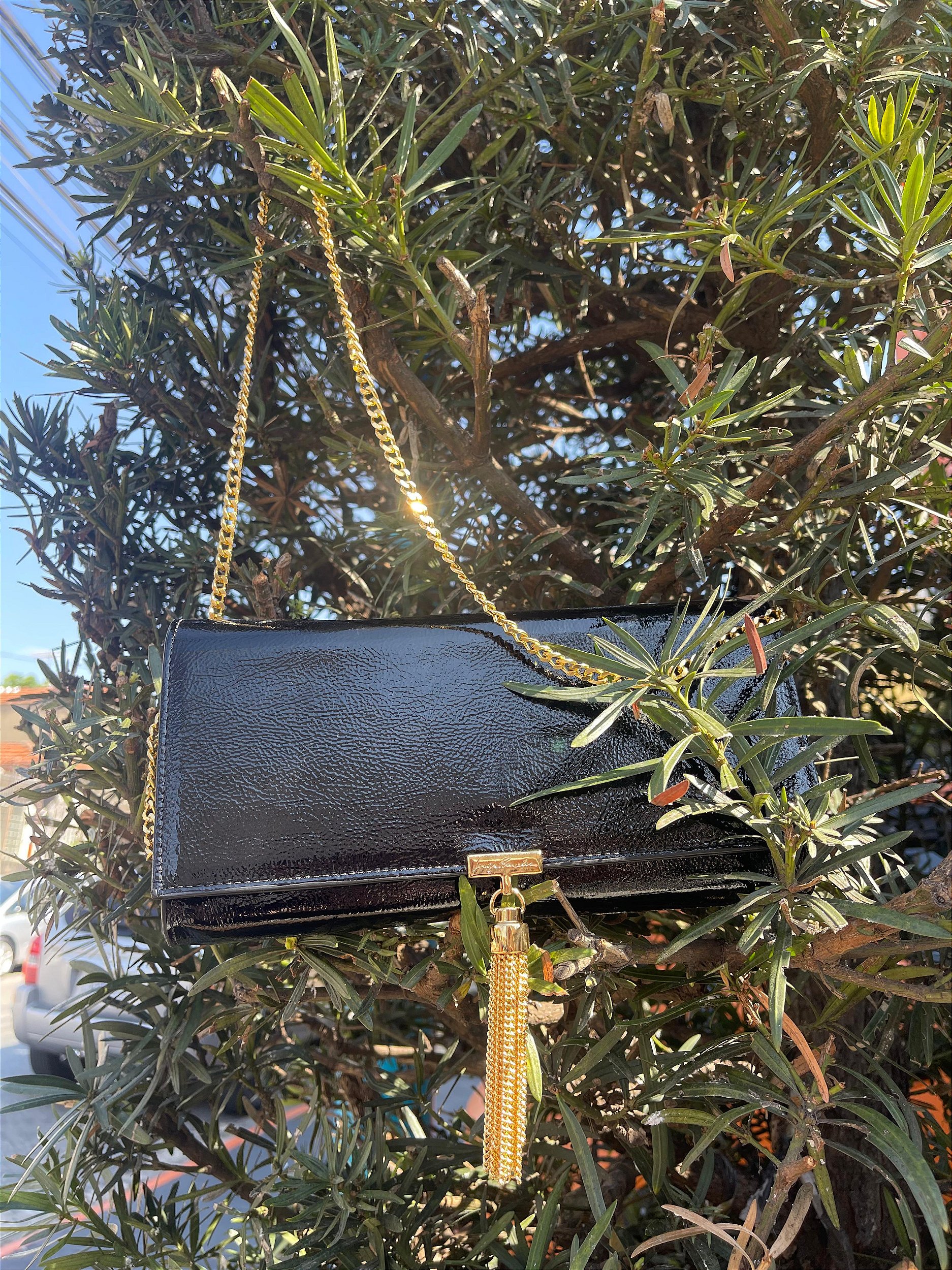 Bolsa preta Luiza Barcelos confeccionada em material com acabamento brilhoso, trazendo sofisticação e versatilidade em uma única peça. O modelo possui shape retangular, alça em corrente dourada e detalhe de tassel metalizado que adiciona modernidade e charme ao design. Elegante e atemporal, é a escolha ideal para compor produções que vão do dia à noite, acompanhando você em ocasiões especiais ou em looks casuais com um toque de estilo extra.