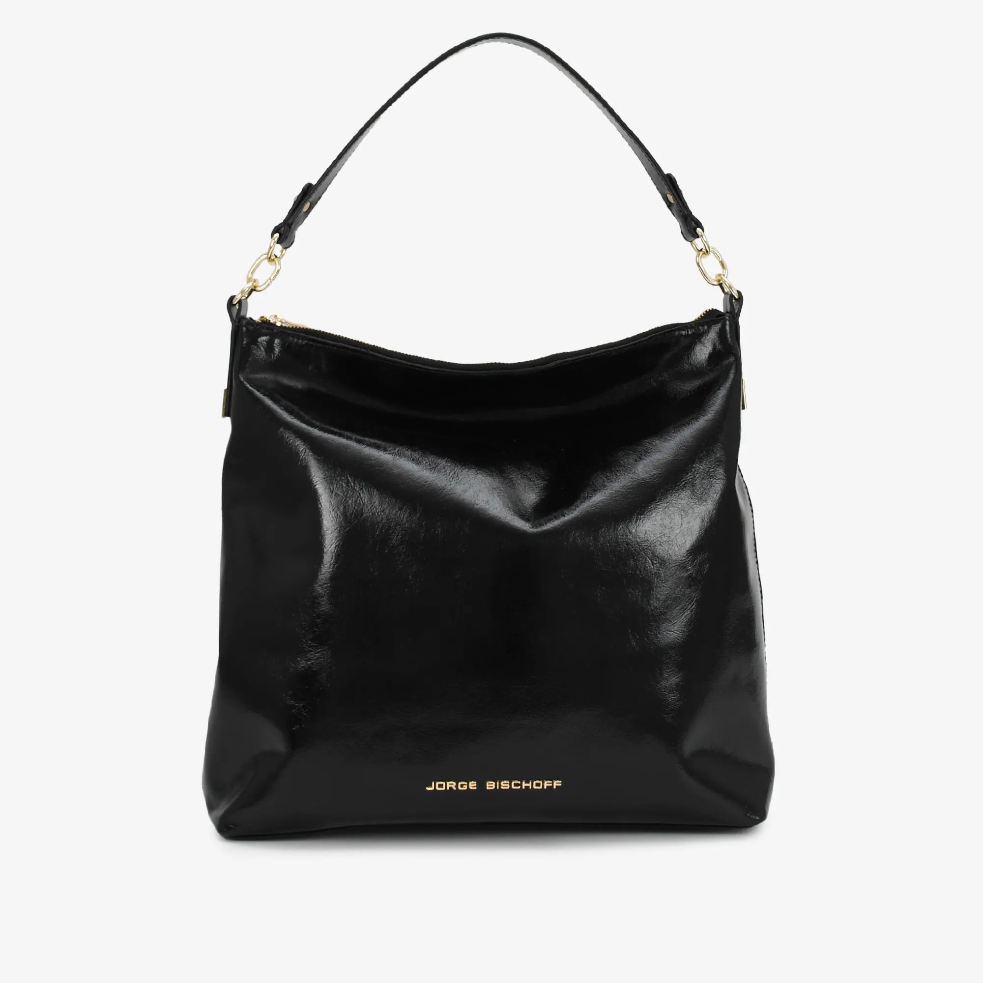 O modelo possui alça de ombro em couro na cor preto, com mini corrente em metal na cor dourado, nas laterais o modelo conta com a placa em metal na cor dourado com as iniciais JB vazadas. Na parte frontal o modelo leva o nome da marca JORGE BISCHOFF em metal na cor dourado. Amplo espaço interno com forro em onça preto e branco, um compartimento para itens menores com fechamento por ziper, assim como o do bolso principal.