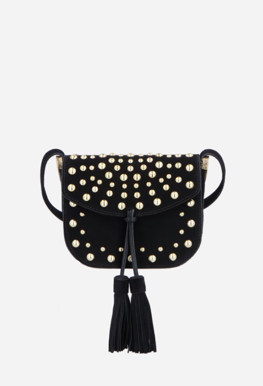 Bolsa Pequena em Camurça/ Preto/ Com Tachas e Franjas/ Luiza Barcelos