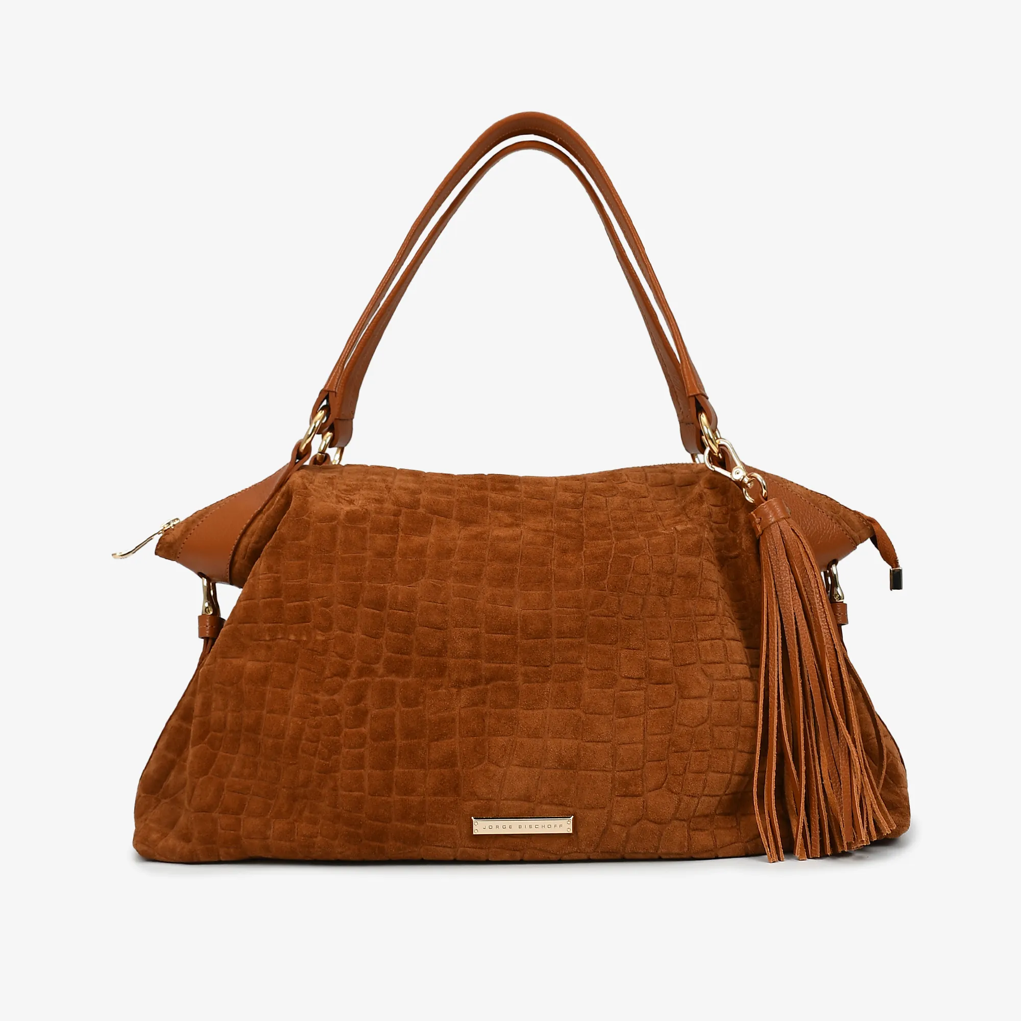 Bolsa Tote feminina com acabamento em couro croco camurça na cor Marrom Caramelo.