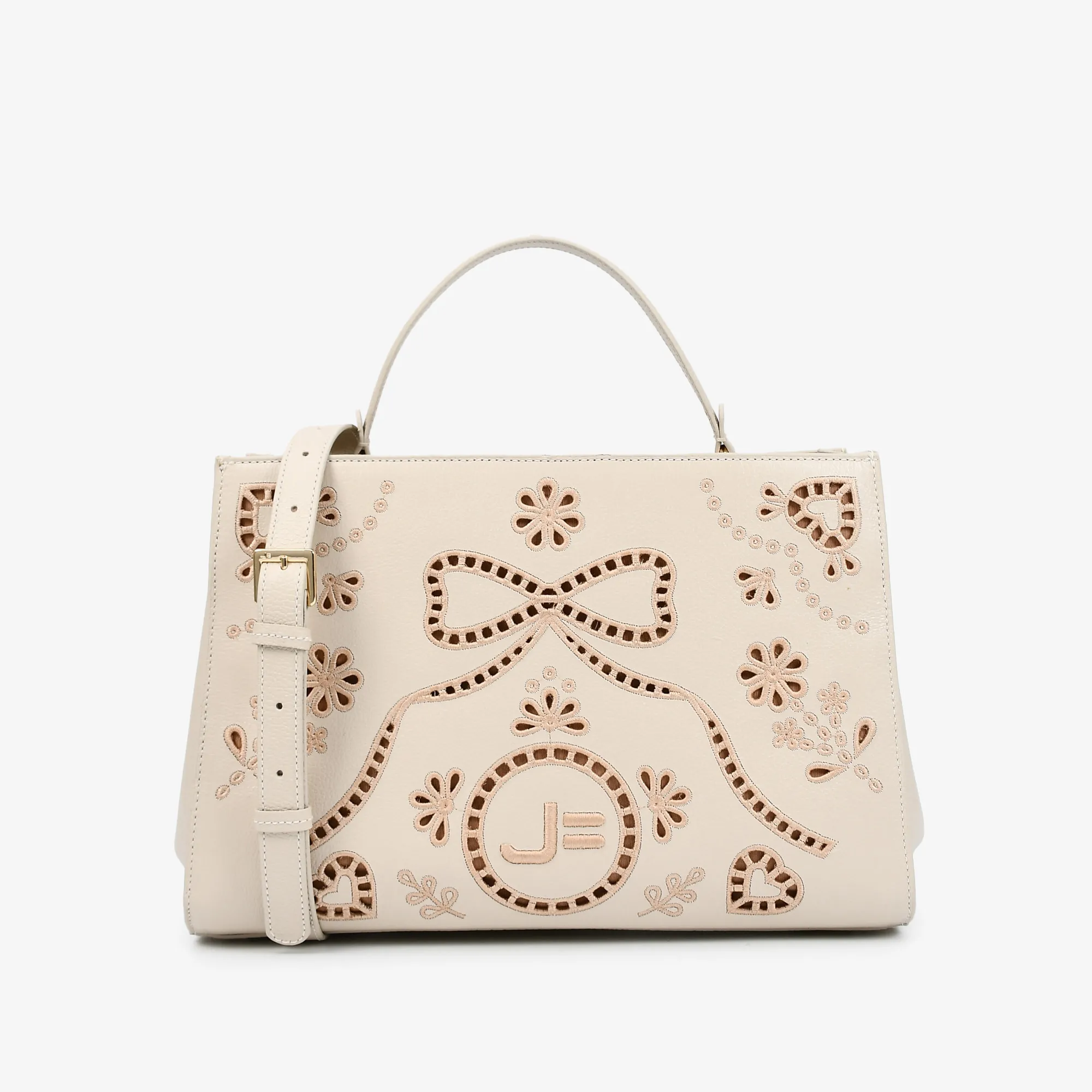 A bolsa apresenta um tom off-white suave, com um trabalho delicado em laser cut que forma laços, flores e detalhes vazados super femininos. O destaque fica para o laço central e para o monograma circular em relevo vazado, que adicionam charme artesanal ao design. O formato estruturado traz elegância, enquanto a alça ajustável permite usar no ombro ou transversal, tornando a peça versátil para composições do dia a dia ou produções mais sofisticadas. Uma bolsa refinada, romântica e cheia de personalidade — perfeita para quem ama delicadeza com presença.