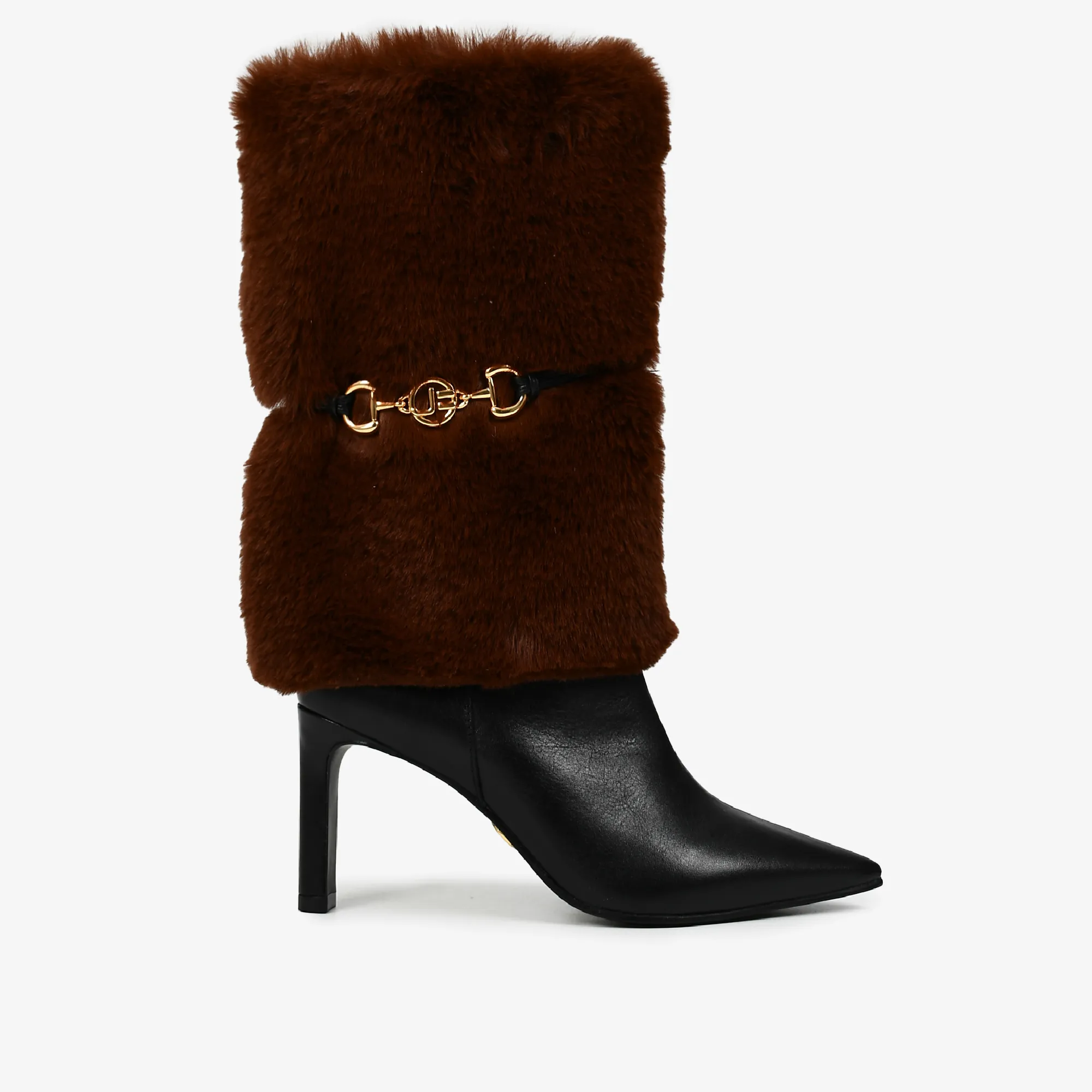 Com conceito 3 em 1, a bota permite diferentes formas de uso: sem o pelo, revelando um visual mais clean e elegante; apenas com o bridão metálico, para uma leitura refinada e urbana; ou com o pelo removível aplicado, criando uma proposta mais fashion e imponente. O sistema de remoção garante praticidade e transforma completamente o visual do calçado, ampliando suas possibilidades de styling. O salto fino confere feminilidade, enquanto a construção equilibrada oferece conforto e estabilidade.