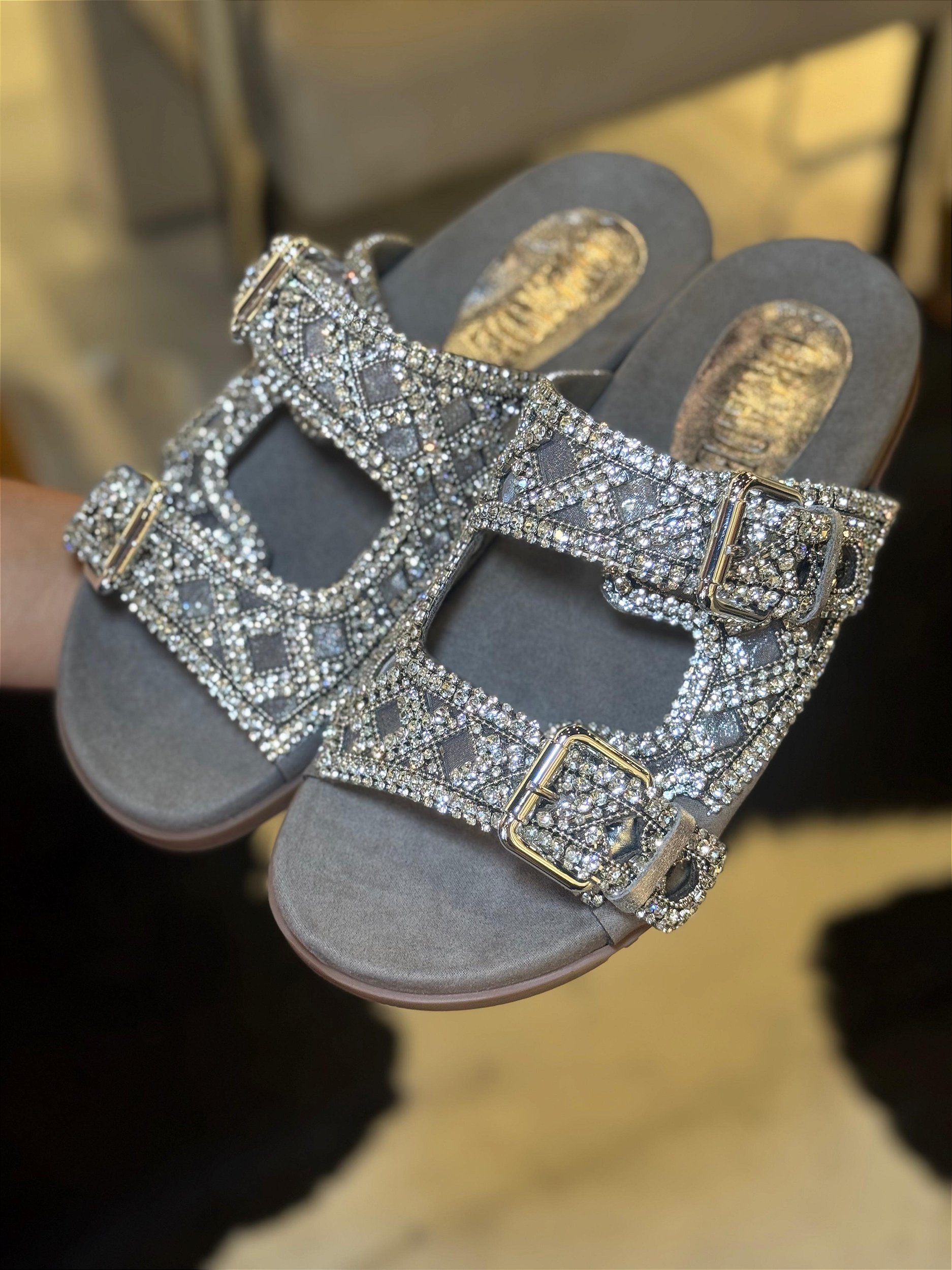 A papete Orcade prata é aquele mix perfeito entre conforto absoluto e glamour imediato. Toda trabalhada em brilhos delicados, ela transforma qualquer look com um toque sofisticado — do jeans básico ao vestido mais leve. O modelo traz tiras duplas com aplicação de cristais e fivelas ajustáveis, garantindo ajuste perfeito e muito charme. Sua palmilha macia abraça o pé, tornando essa peça um luxo para usar o dia todo.