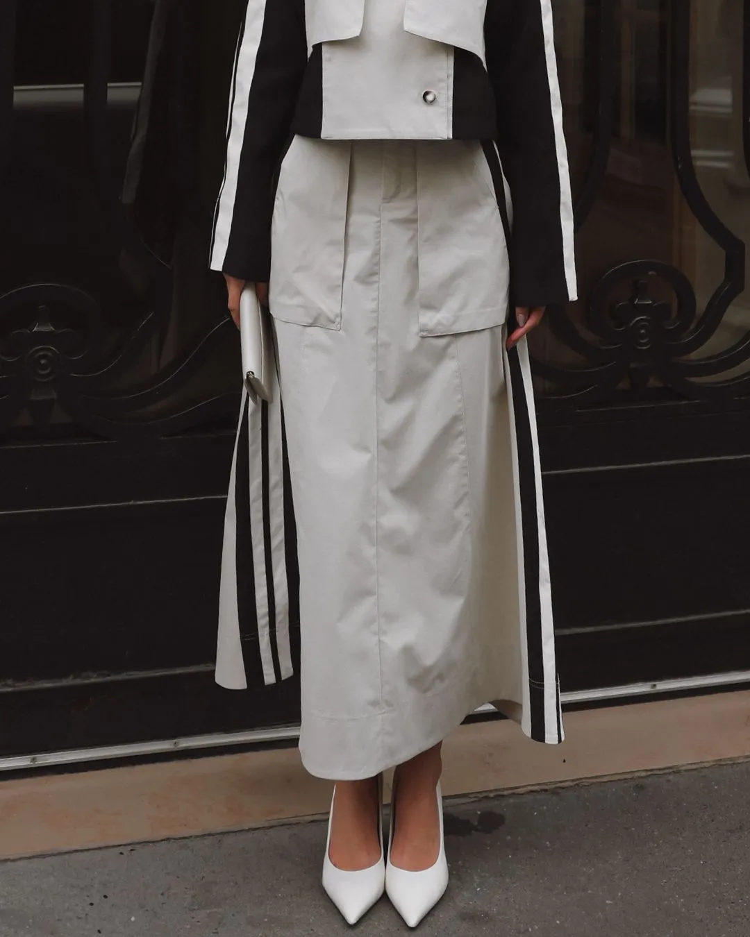 Saia Bege em Tecido Tecnológico. Modelo midi, cós alto, bolsos fole, recorte lateral faixas, pespontos rentes, fechamento em zíper com botão transparente interno e botão externo. Ideal para usar com casaqueto ou colete. Look Sport Chic.