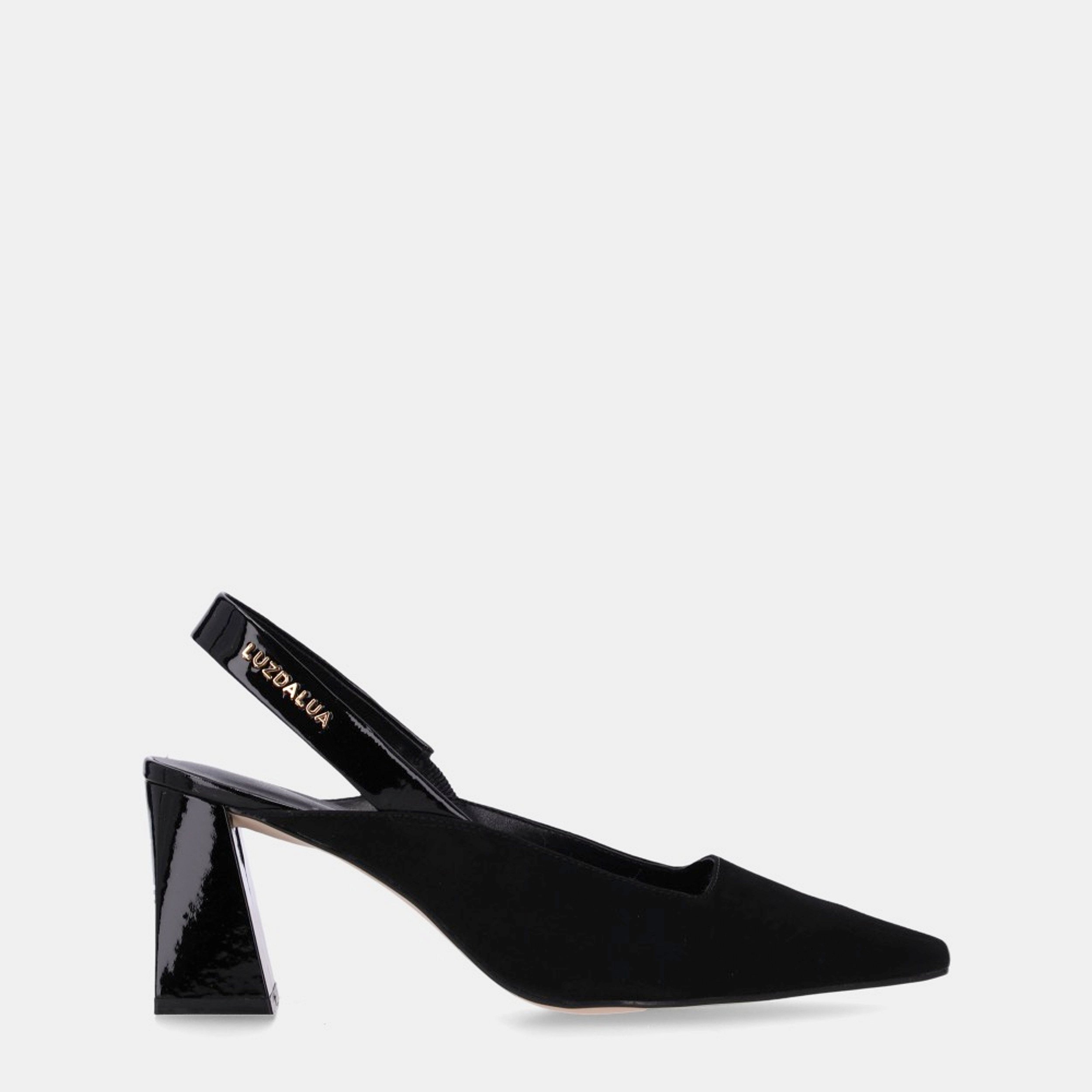 Força visual em altura estratégica. Este slingback de salto alto em cervo preto combina textura diferenciada com presença vertical. O preto absoluto dispensa ornamentos, deixando que a qualidade do material e a precisão do corte comuniquem por si. A tira posterior oferece segurança mesmo na altura, ideal para longas jornadas em eventos formais. Para quem busca impacto através da elegância contida, não da ostentação.