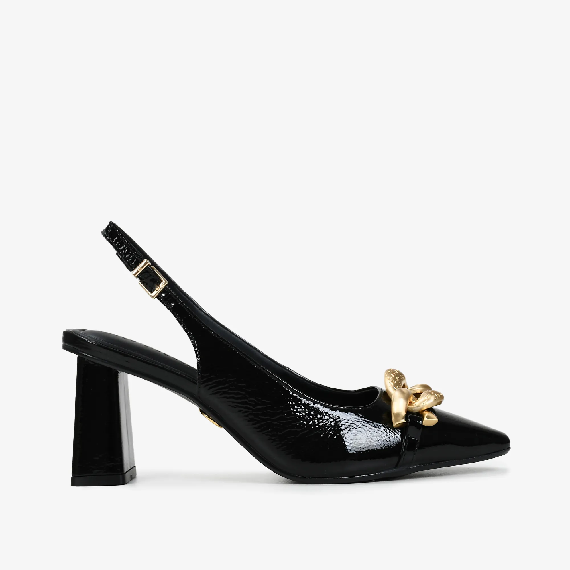 O Slingback Preto Couro Verniz traduz a sofisticação contemporânea em uma silhueta elegante e marcante. Confeccionado em couro verniz de brilho intenso, o modelo apresenta bico levemente afinado e salto estruturado que alonga a silhueta com equilíbrio e feminilidade, reafirmando o poder atemporal do preto em produções refinadas.