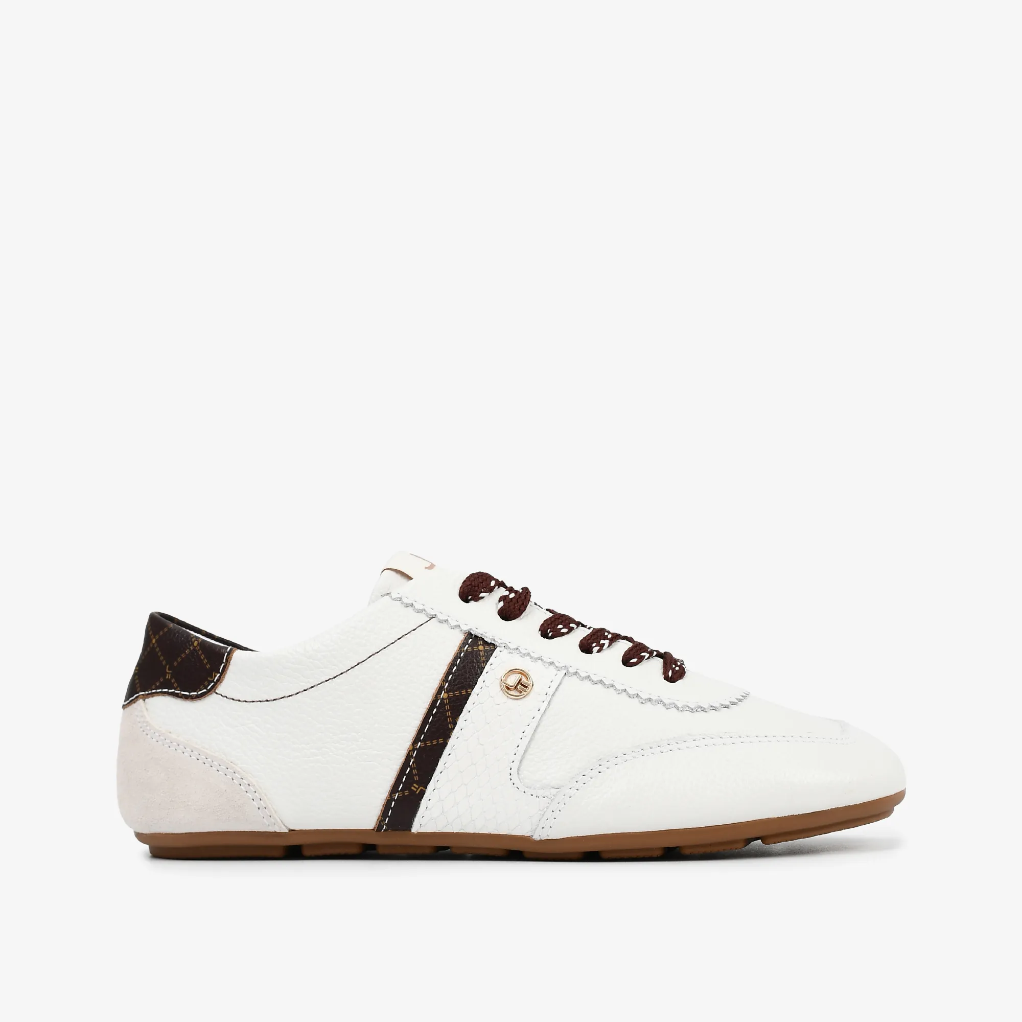 Tênis feminino com acabamento em couro na cor Branco e detalhes da exclusiva estampa Monograma JB.