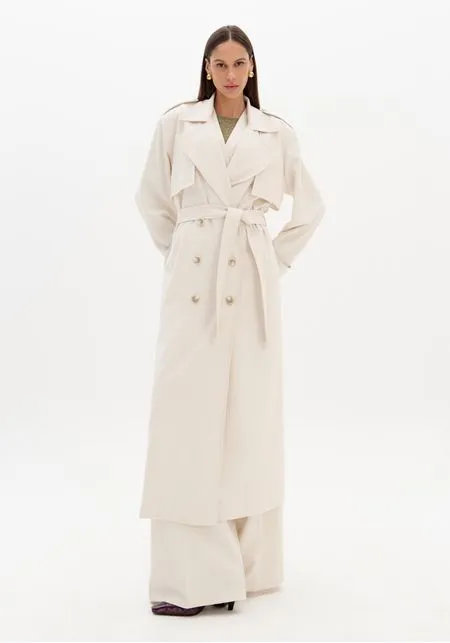O trench coat alongado confeccionado em tecido de alfaiataria encorpado traz mangas longas, maxi lapelas, fechamento por botões e pala sobreposta que imprime sofisticação ao visual. A faixa acompanha a peça e garante versatilidade nas produções. Aposta da estação!